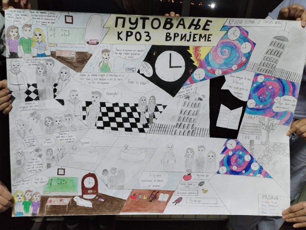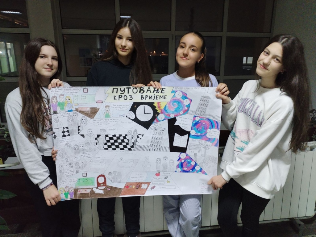 У нашој школи Дани науке су ове године обиљежени кроз забаву, игру и занимљиве идеје наших ученика. Учествовали су ученици СТЕМ секције седмих и осмих разреда. Ученици централне школе: Хелена Миловановић, Хана Цветковић, Весна Савић и Софија Чолић урадиле су пано под називом “Путовање кроз вријеме”. Њихова идеја је била да физику представе кроз стрип. Поред израде паноа, били смо у посети првачићима, где смо им кроз огледе са бојама, лоптама и балонима показали колико наука може бити занимљива.